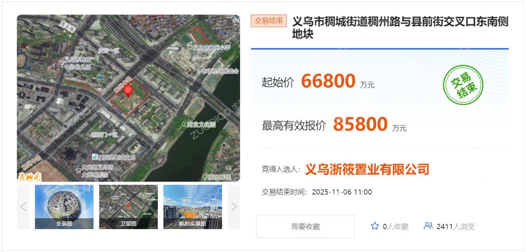 11月6日,经过39次出价,义乌市稠城街道稠州路与县前街交叉口东南侧地块成功出让,地块成交价85800万元。